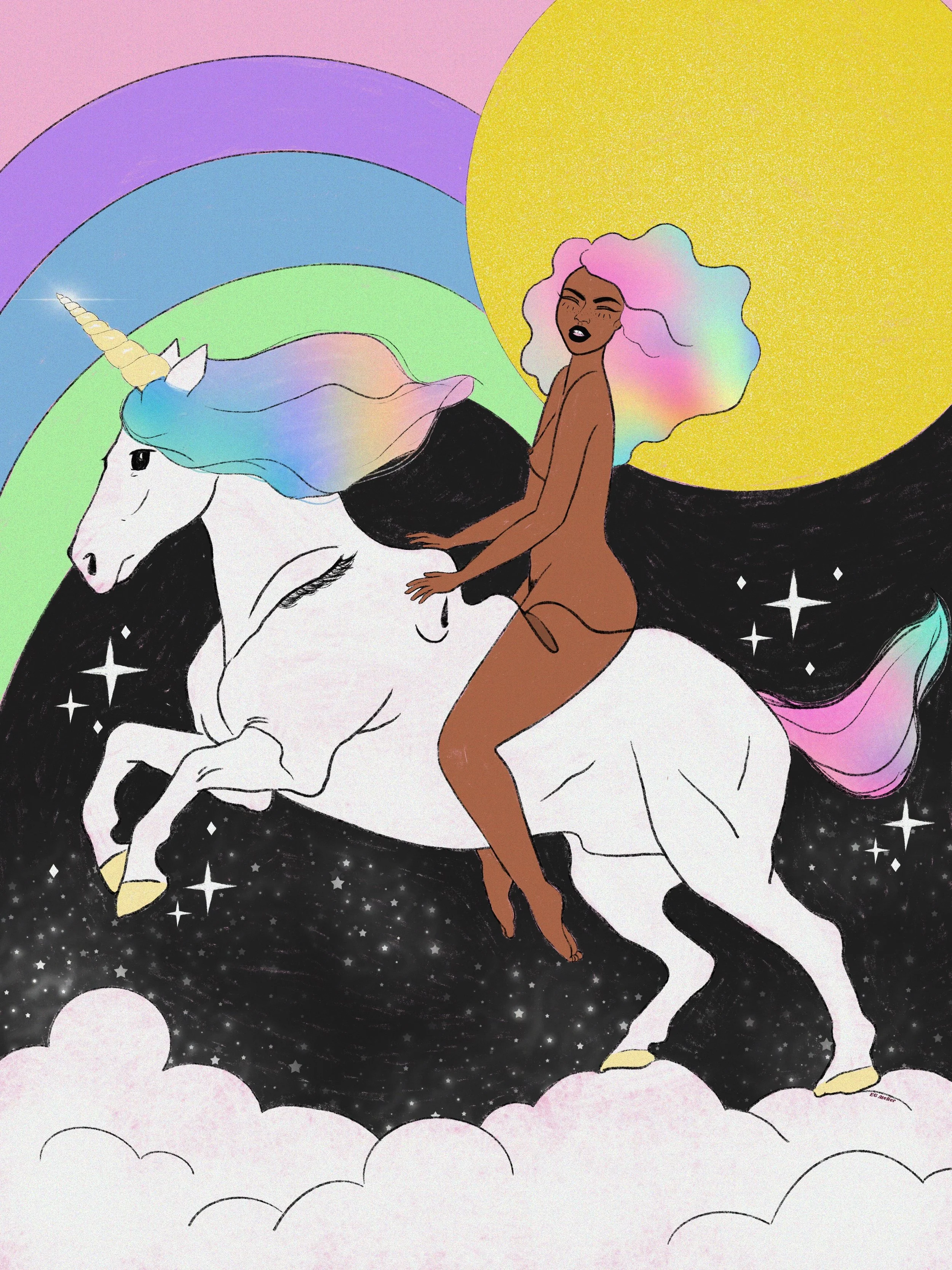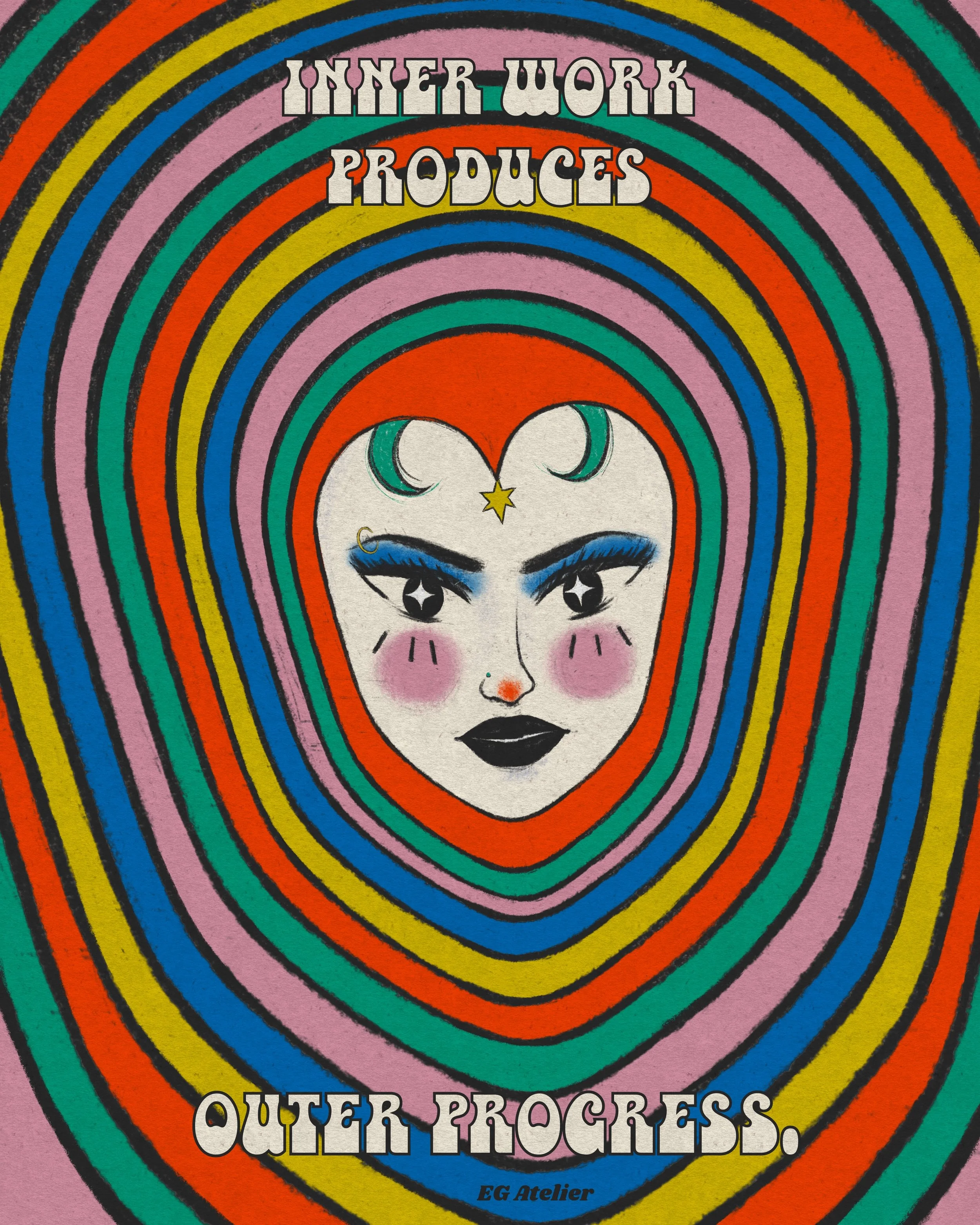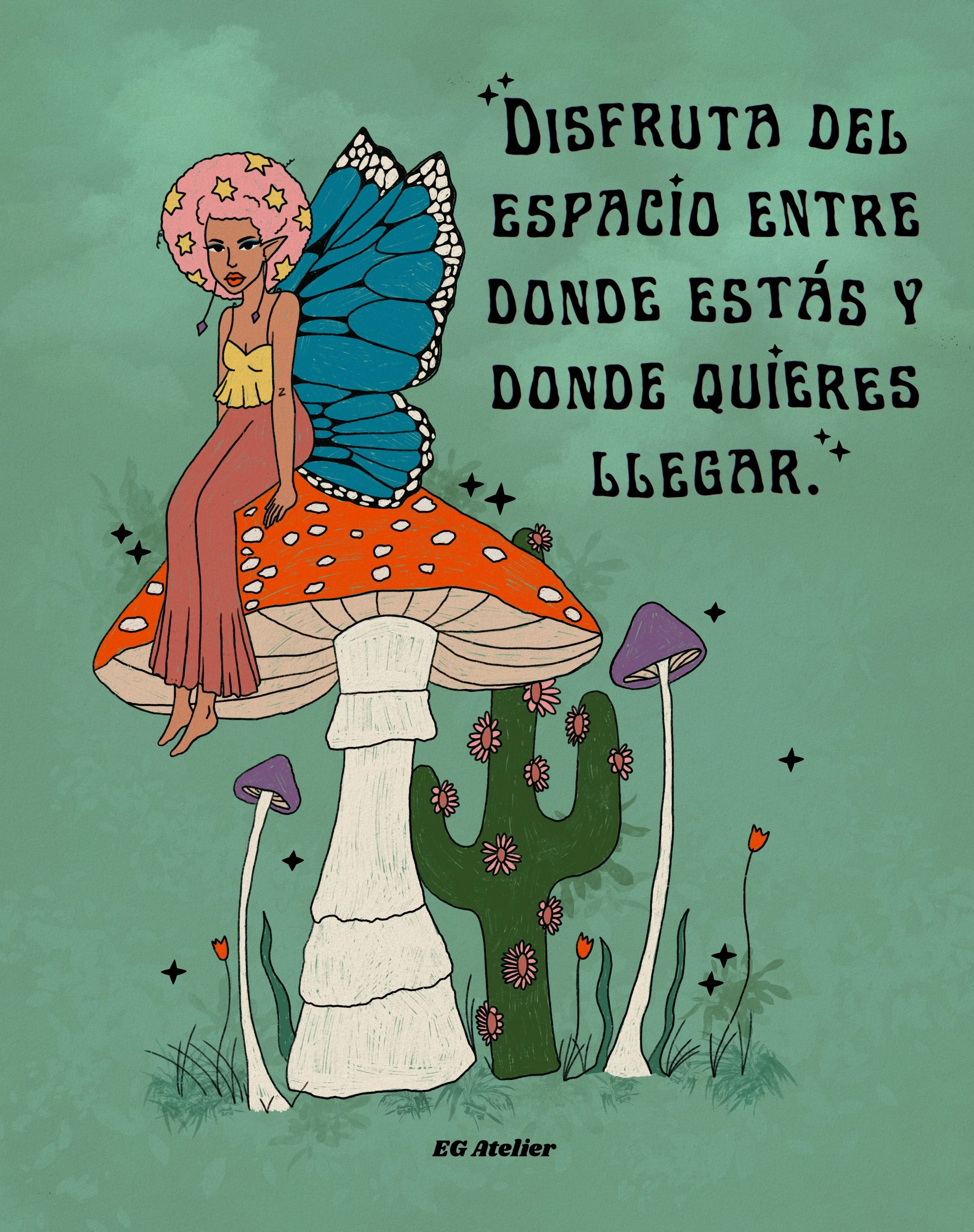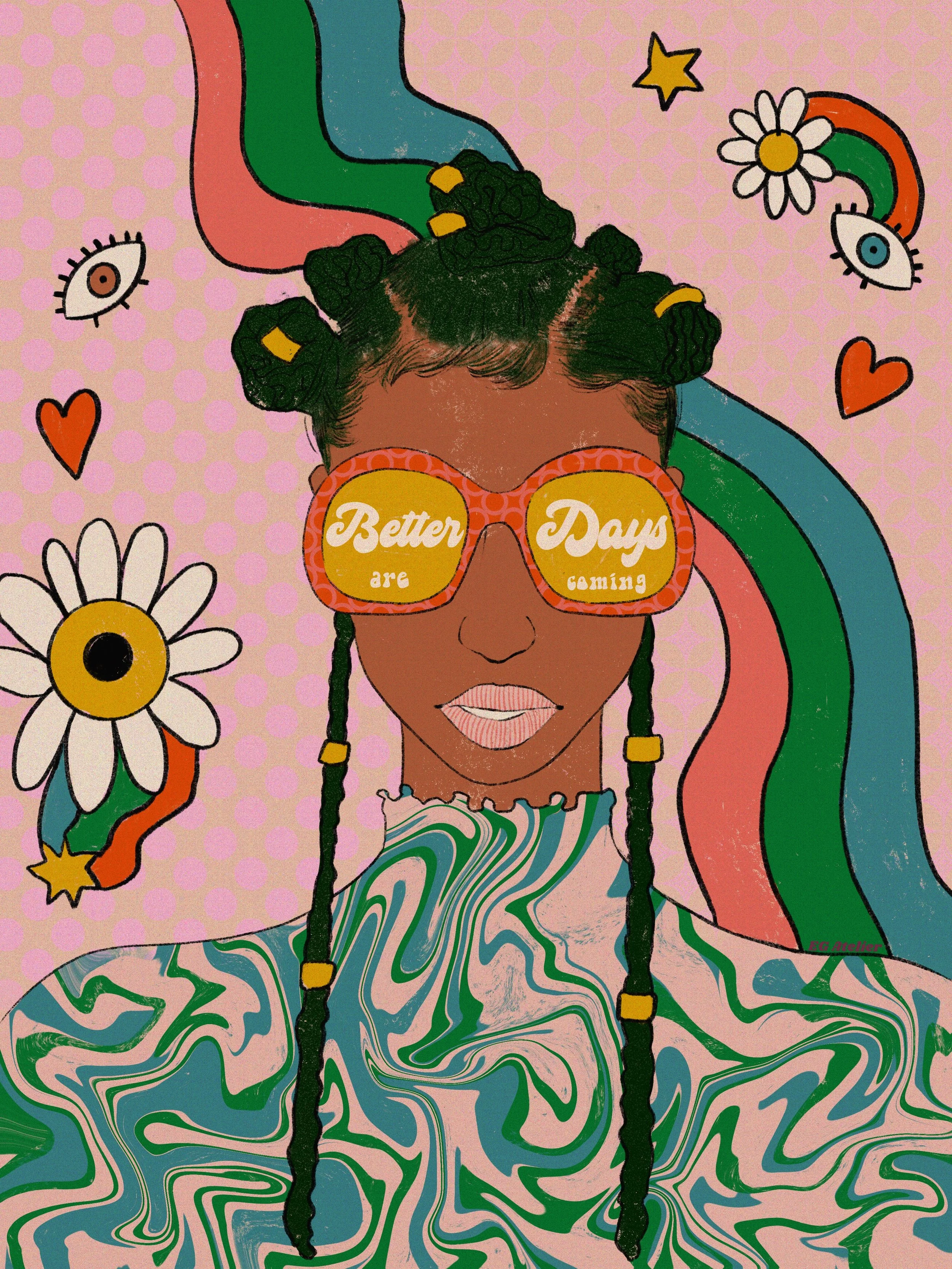 The main character in most of my work is color. As a former art teacher and guidance counselor I am heavily inspired positive psychology, by women empowerment and vintage art. Especially music festival posters from the 70s, 80s, and 90s. I like to evoke in the viewer feelings such as nostalgia and joy through colorful,whimsical art with messages of encouragement. Because I believe art can be healing not only during it’s creation but also in appreciation.